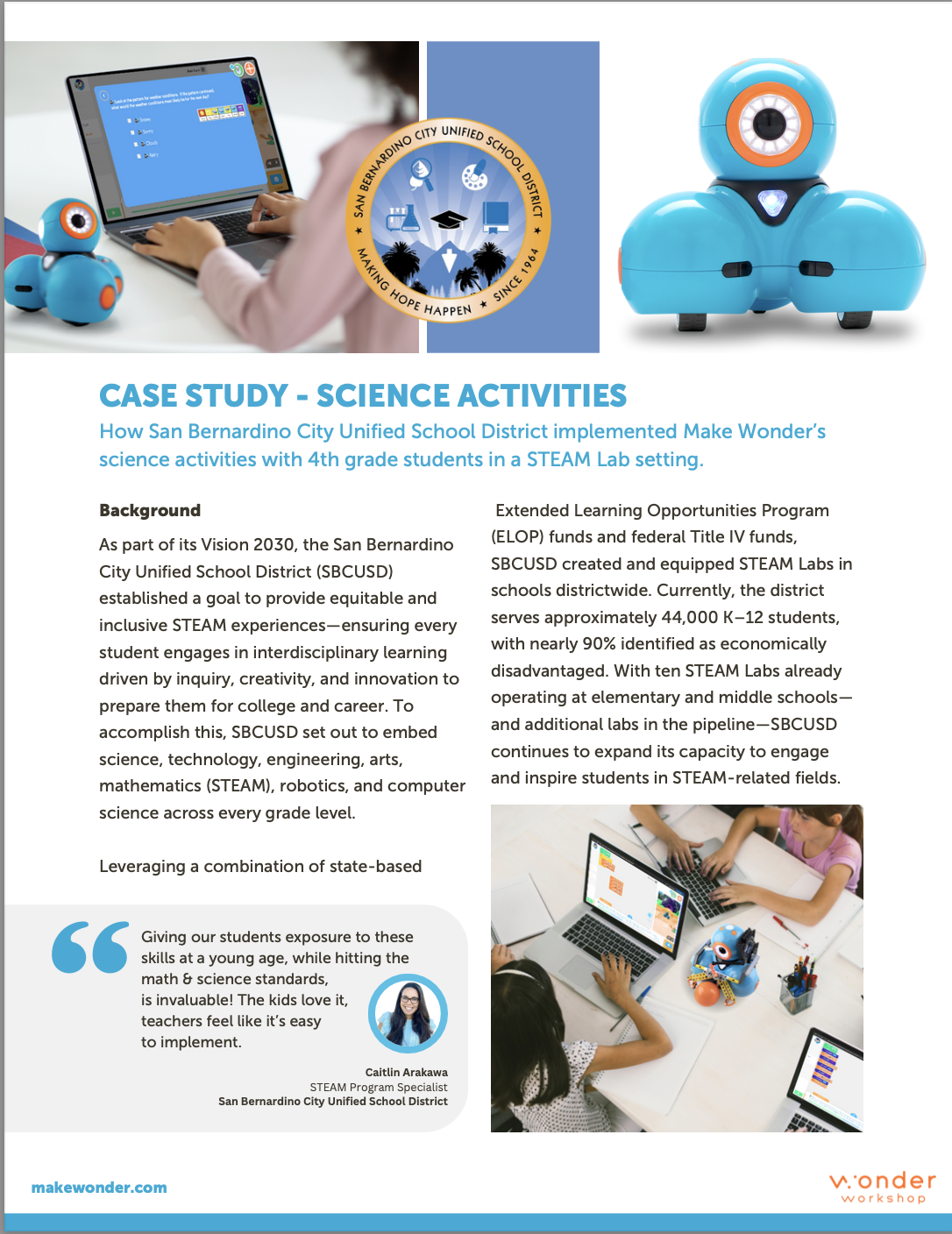 See how the San Bernardino City Unified School District implemented Make Wonder’s science activities with 4th grade students in their STEAM Lab at Lytle Creek Elementary School.