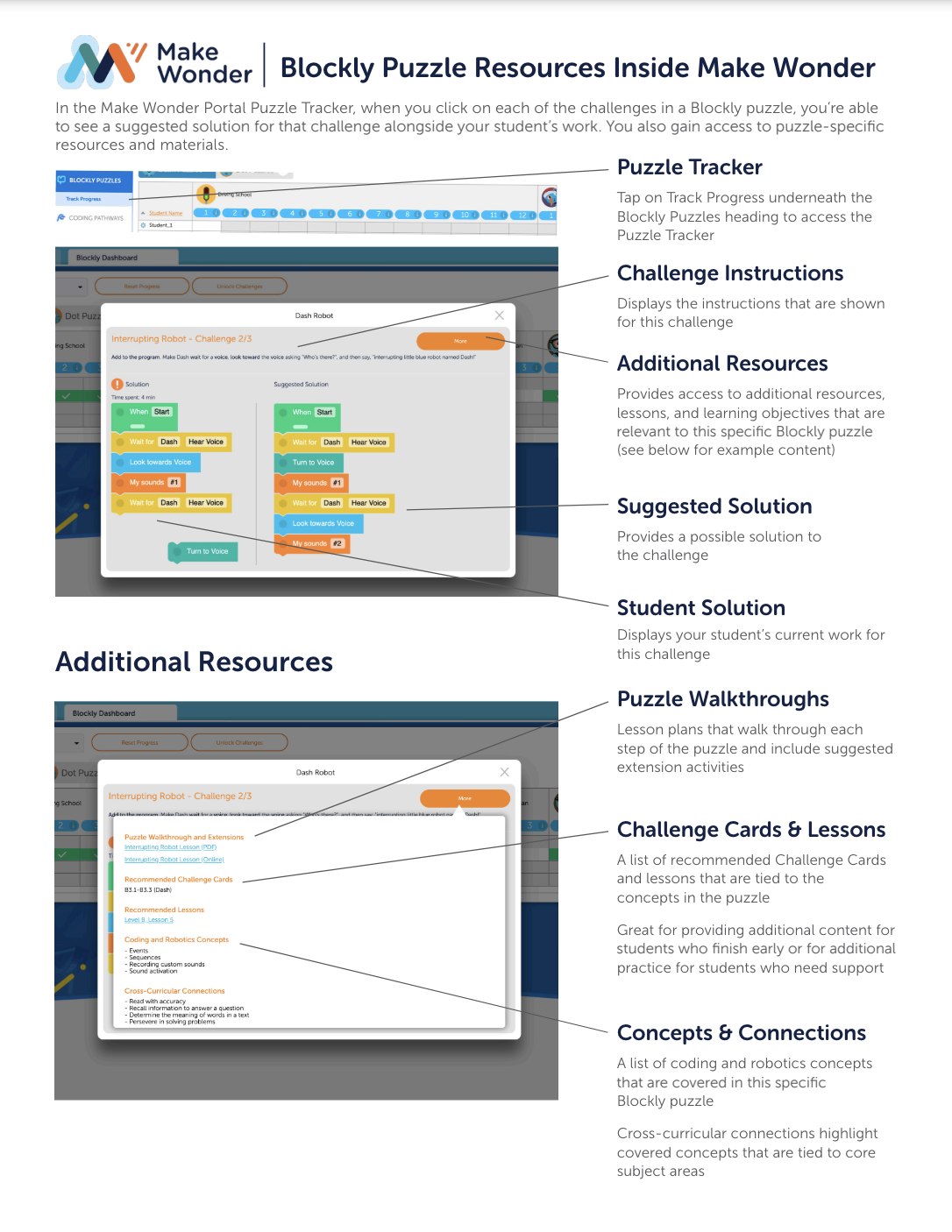 This introduction to Dash and Make Wonder provides a comprehensive look at Dash, the Blockly app and the puzzle tracking and other features available to you in the Free Tier of Make Wonder. Bookmark this guide to refer to it again and again. Since it’s digital, it’ll always be up to date and it also includes video tutorials!