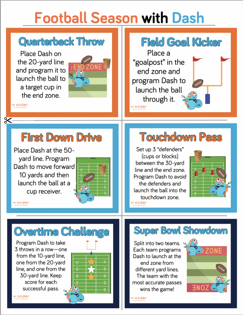 Each task card sets up a football scenario—like programming Dash to launch a ball into a target cup in the end zone or navigate defenders before making a touchdown pass
