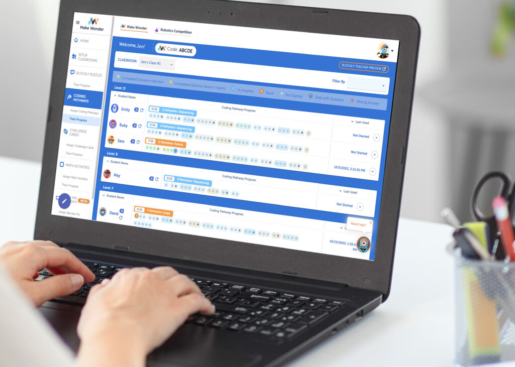 With Make Wonder, we simplify creating a coding curriculum by providing pre-built lessons and activities that are assignable and trackable from a teacher dashboard. Students’ eyes will light up as they embark on coding adventures with Dash in a vibrant virtual world or with physical Dash in the classroom.