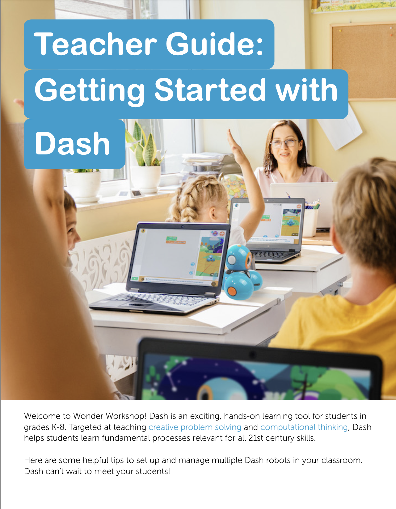 At Wonder Workshop, our award-winning Dash robot, suite of apps, collection of accessories, and Make Wonder platform encourage play and learning to make creative problem-solving concrete and tangible. Congratulations on your purchase. Now the fun begins!